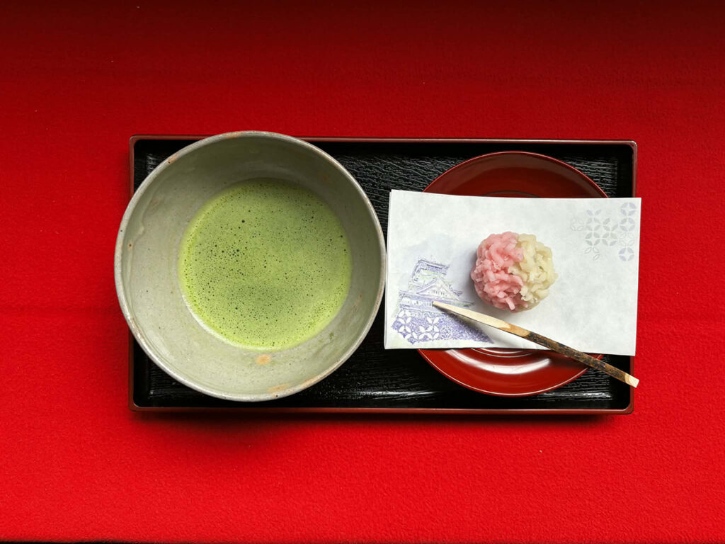 小倉城庭園では、立礼席(机と椅子のお茶室)にて、抹茶(煎茶)と季節の御菓子を提供しています。